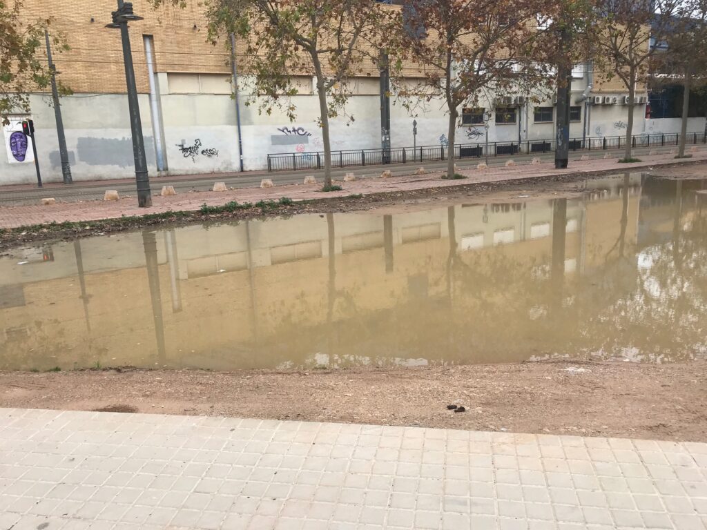 Como siempre que tenemos temporal de lluvias, en concreto, estos dos solares quedan totalmente anegados por falta de drenaje. Seguimos así desde las obras de la apertura de la calle Tamontana -que comunica la calle Ingeniero Lacierva con la calle Olba- incluso mucho antes.